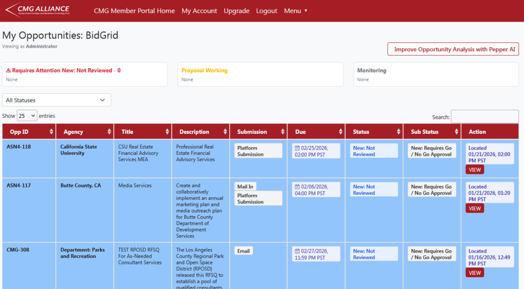 Log in to the CMG Member Portal and open My Opportunities: BidGrid.